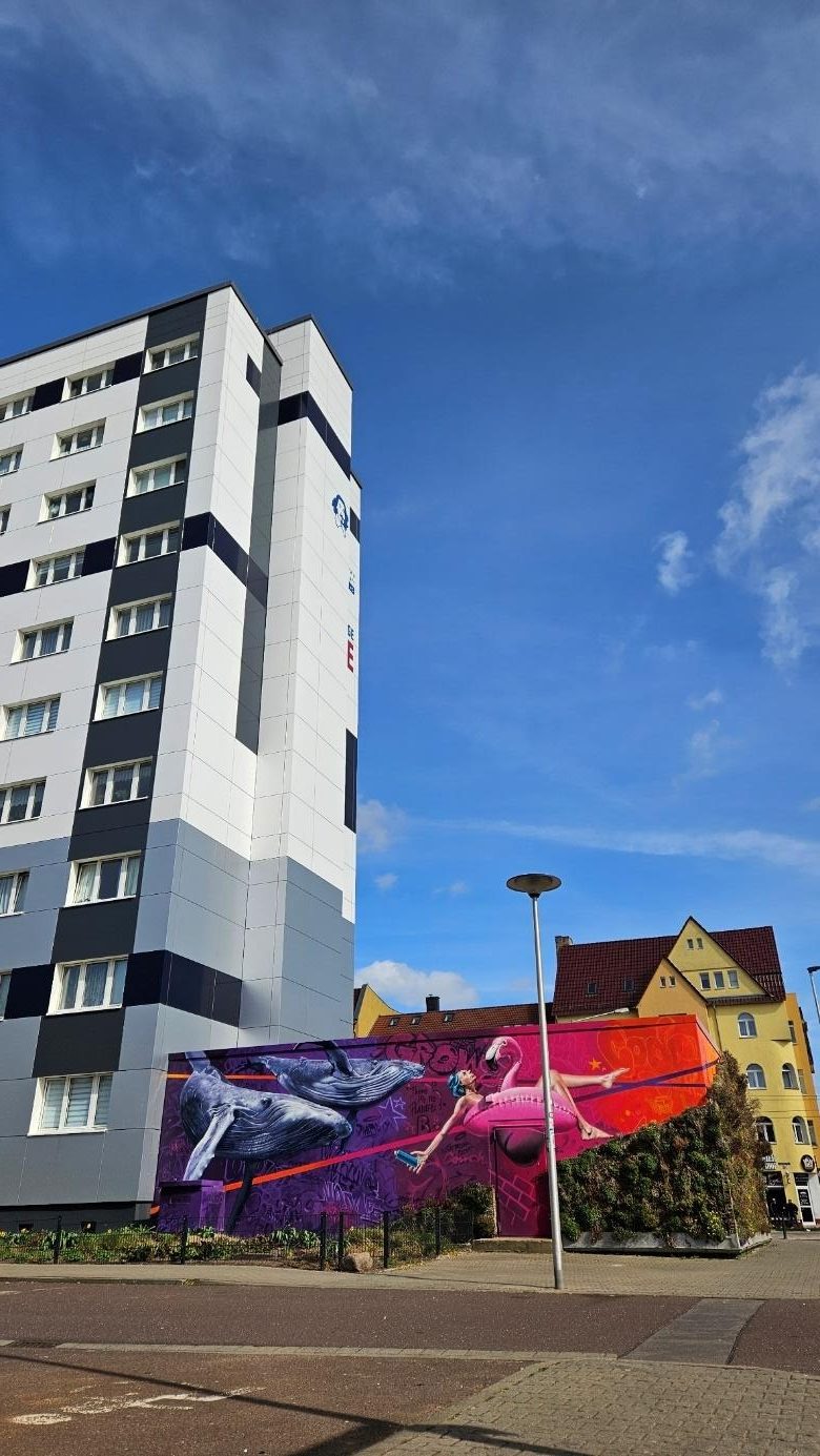 After the collapse of the Soviet Union and Germany’s reunification in 1990 zeitgeist and political ideas shifted. People started to seek individuality, and the once novel style of construction was increasingly considered ugly and hostile to life, with its high, uniform facades that do not allow for much sunlight to reach the ground, creating a sometimes even intimidating atmosphere, which was also mocked by West German media (Richter, 2006). In recent years, city administrations and housing cooperatives have renovated many Plattenbau buildings, which are still considered useful and necessary to accommodate the increasing population in cities (Ottersbach, 2023). In Magdeburg, facades began to be renewed and splashed with color and artwork as an attempt to bring change, individuality, and new life to the districts. Magdeburg Neue Neustadt showcases a fascinating example of tracing (East) Germany’s post-war history through architecture. Contrasts abound: renewed Plattenbau buildings stand beside older ones now serving as social housing, small detached houses sit in the shadows of high-rise buildings, and processes of change and renewal coexist with enduring GDR memories. The city’s architecture opens a window to its past and present to those who observe curiously.